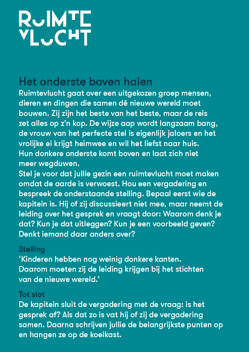 Een ruimteschip vertrekt naar een beter leven. Mensen en andere dieren dringen om binnen te komen, maar de selectie is streng. Alleen het beste van het beste mag aan boord. Het helderziende meisje en de geleerde giraf hebben tickets weten te bemachtigen. Voor de sterkste gedachte en de puurste liefde zijn ereplaatsen gereserveerd. Als het schip opstijgt kijken zij naar de verwoeste aarde. Er is geen tijd om lang te treuren, want zij zijn de elite, het beloofde volk dat de beschaving moet redden. Maar aan boord blijkt een verstekeling…